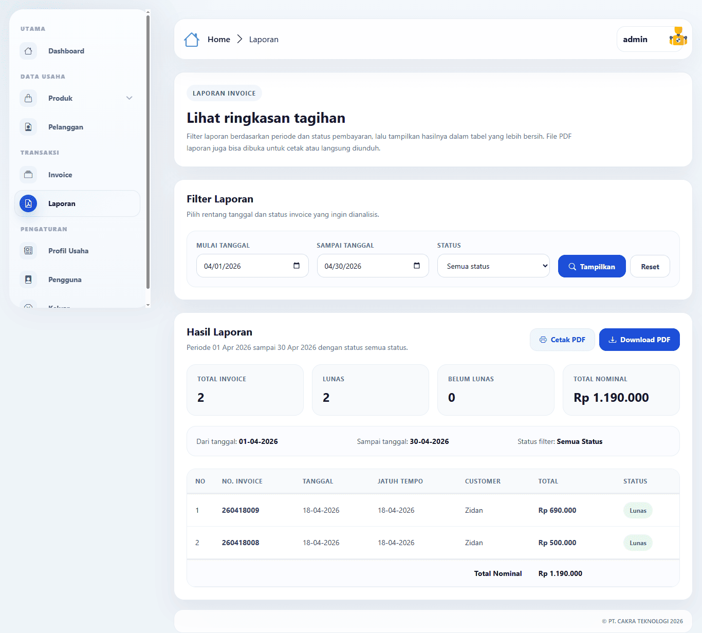 Anda dapat langsung mengirim invoice ke pelanggan melalui WhatsApp hanya dengan satu klik. Fitur ini sangat membantu mempercepat proses penagihan tanpa perlu aplikasi tambahan. - Laporan Bulanan